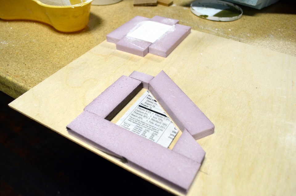 First I made templates of all the necessary pieces from cereal-box cardboard. I then laid out the shapes on MDF. As soon as I set my pencil down, I discovered Problem One: the forms need to be mirror images, because the castings are made face-down. No big deal, right? Grab another chunk of MDF and draw them the other way around. Once that was done, I framed up the drawings with pieces of poplar, and cut more cardboard to fill out the areas between pilasters of the finished castings. The bridge abutments themselves needed to be thicker, so I grabbed some 1/4″ MDF, cut it into sticks, and set them on edge to define the abutments. All the formwork was tacked together with white glue, and everything sprayed afterward with furniture wax.