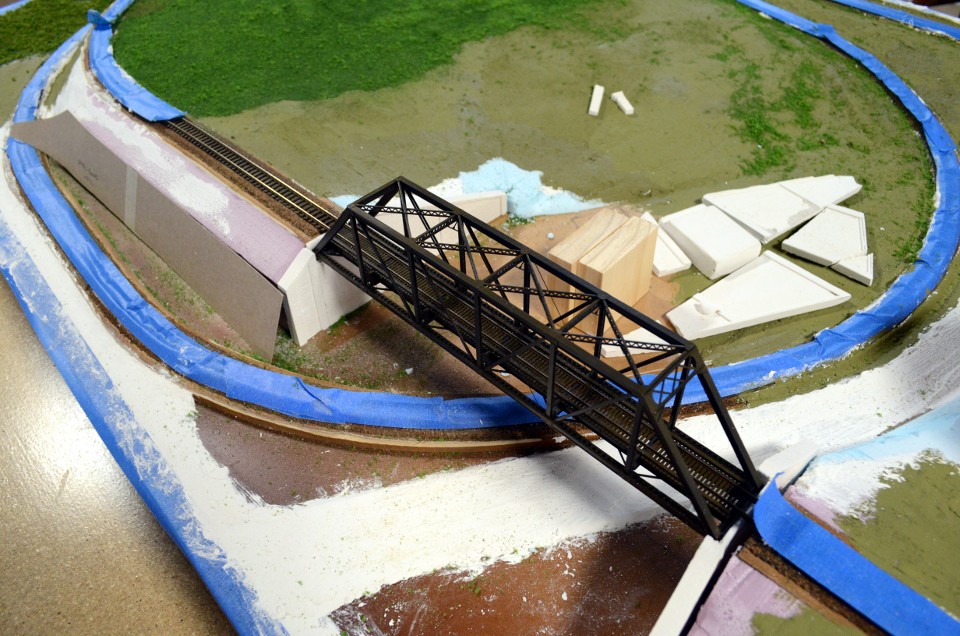 Installation was accomplished using PL300 foamboard adhesive, the same stuff I used to install the track. It dries slowly enough that I can shift and shim as needed to make everything line up. I then backfilled with a few careful applications of Sculptamold, and painted with my standard foliage-tone flat latex.