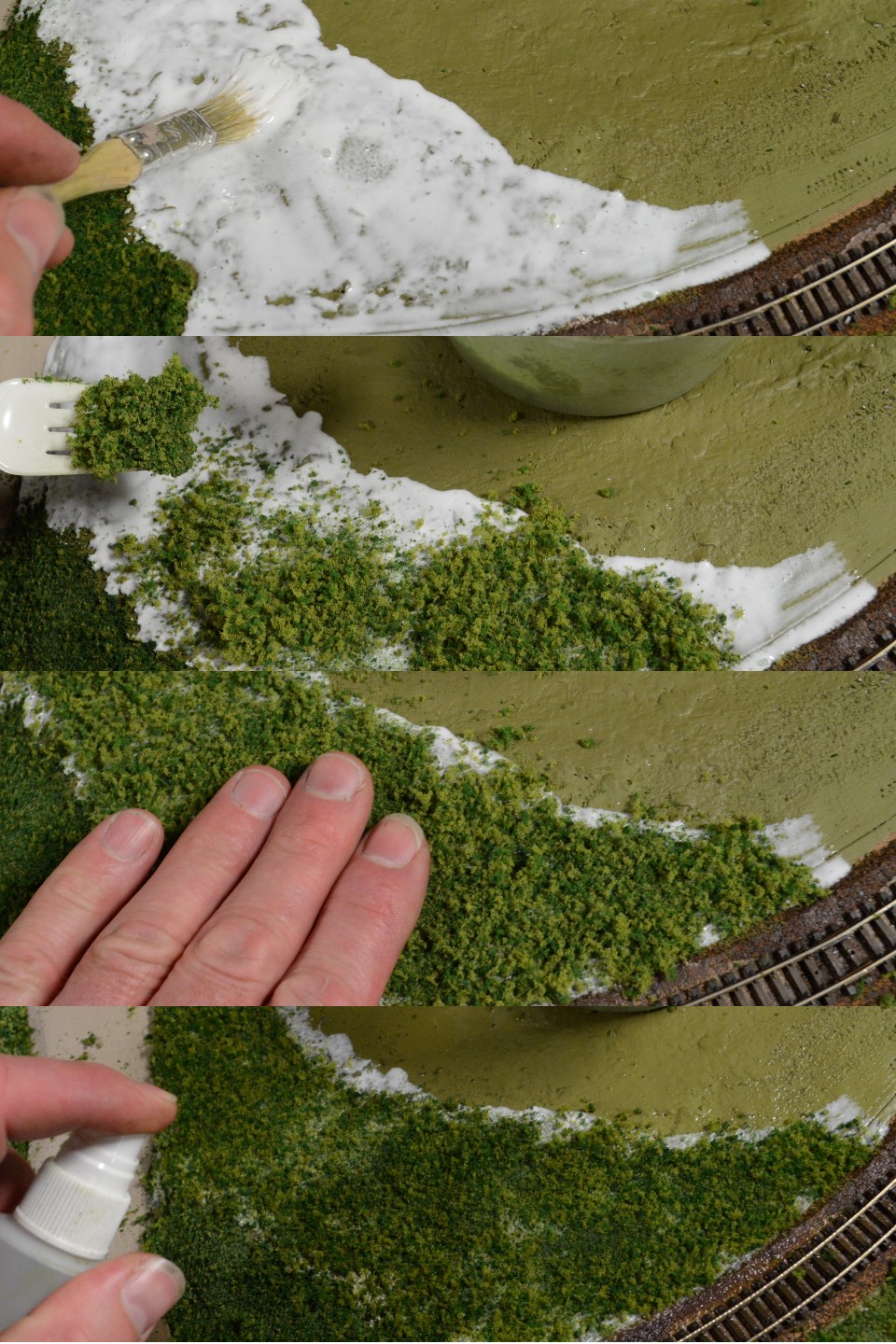 I do ground cover in small patches, maybe a third of a square foot at a time. I try not to leave a straight border, lest the railroad end up looking like a green quilt. Once a patch is covered, it needs overnight—or longer—to dry. With the surface covered in millions of tiny sponges, it doesn’t set up in one hour like a wood joint!