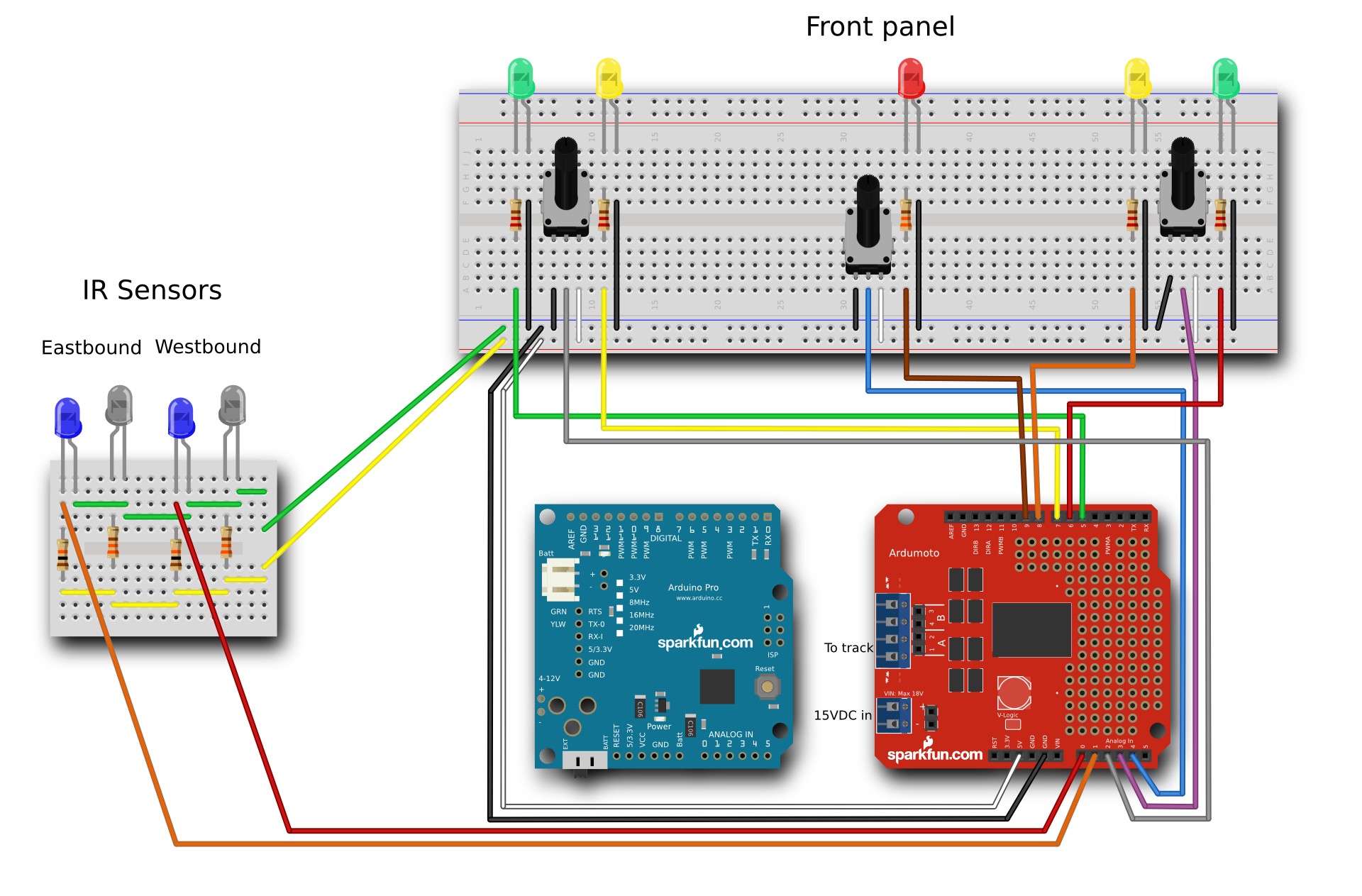 For those of you not already familiar with this project, Chuck wanted a throttle to automatically send two trains around a loop, in sequence, in opposite directions. Sounds like another job for Arduino!