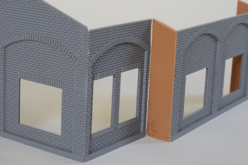 The hobby shop, after rooting around in their supplies, provided a scruffy-looking Kibri brick-wall tile from which the needed parts could easily be cut, but the brick pattern wasn’t an exact match to the Heljan walls. I set the project aside to consider my options. That was three years ago.