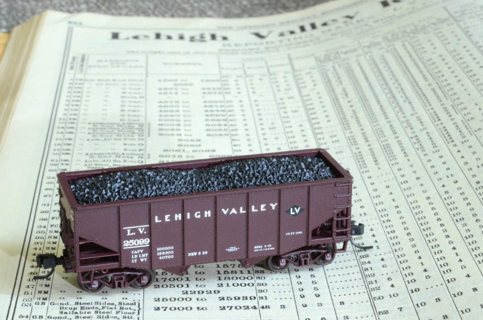 Example 2: LV 25099. This car is an Atlas model of a USRA two-bay, 55-ton hopper, the kind that was used by many railroads from World War I into the Sixties. Coal was the Lehigh Valley’s big commodity, of course, so they had a lot of these. Atlas has made them in multiple numbers, and I picked up several. It has a build date of 1939. Am I safe? Page 164 shows that there were 546 cars in the block of numbers between 25000 and 25939—one of the most heavily-populated entries in the Lehigh Valley’s listing. Verdict: no problems here.