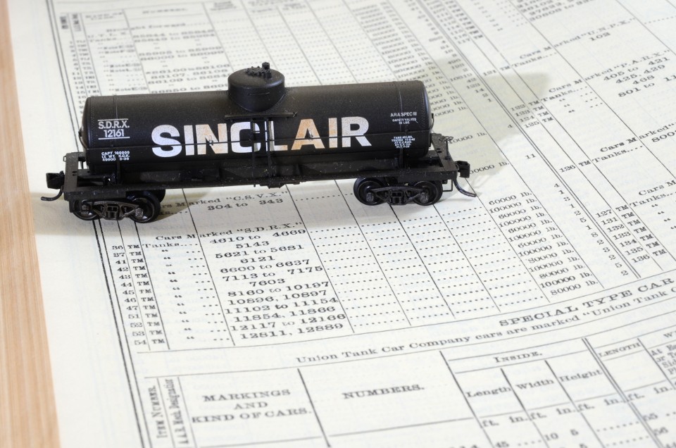 “Sinclair” Google leads me to a nice Wikipedia page on Sinclair, which in turn leads me to Sinclair’s web site. It so happens that they have a very comprehensive history up to 1969 posted, which reveals that “SDRX” was indeed Sinclair’s own reporting mark, that they owned over 6000 tank cars at one point, and that those cars were sold as part of a 1957 restructuring plan (the same plan that resulted in the closure of the Wellsville refinery). Okay, mystery solved. Sinclair sold off a non-core asset—their tank car fleet—to a company in that business—Union—and those cars were gradually retired or re-labelled with their own “UTLX” mark. Verdict: one SDRX car in a sea of UTLX cars is plausible in 1963. Luckily, I have a number of Micro-Trains UTLX tanks on hand for just such an emergency.