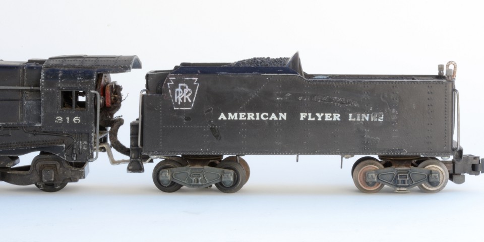 I have a thing for American Flyer K-5s. The 312 I got for Christmas when I was ten is my all-time favorite engine. Except for the swastikas, this 316 was a nice example, and Paul was understandably eager to get it off his hands, so a deal was struck. I took it home, set up a loop of American Flyer track, and test-ran it. Damn, but it ran nice. Too bad I can’t take it anywhere in this condition, I mused. I put it on the most obscure piece of shelving I had, and let it collect dust for a decade or so.