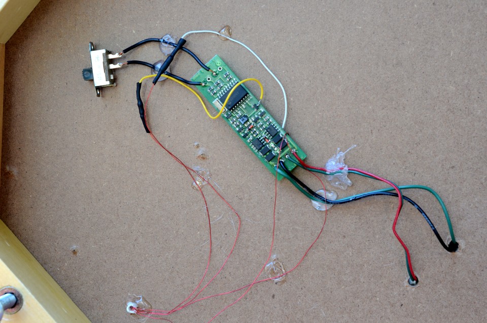 A cut-down secondhand NCE Switch-Kat, with a slide switch for programming, installed under the module. Not pretty, but functional.