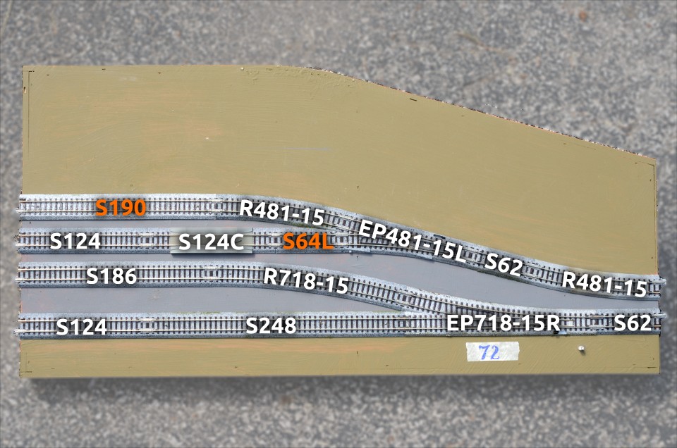 Each end module has two custom-cut pieces of Unitrack. The S64L seen here (and the S64R on the opposite module) are regular S64 straight sections with one corner of the roadbed sliced off for clearance at the turnout end. Kato’s #4 turnouts come with a S60R and a S60L in the package; this is a slightly longer version of that. The S190 has been cut down from a S248. (I could have filled the space with S62 + S64 + S64, if I liked the gratuitous use of rail joiners, which I don’t.) Shortening a piece of Unitrack is not as hard as it looks. Mike Fifer has nicely documented the procedure. I made a Unitrack miter box out of scrap wood, which makes it even easier.
