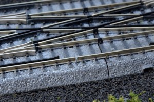 Turnout indication was also desirable, naturally. The indicators I installed on the yard modules last year have been fantastic, so I did something similar here. I used the same bi-color LEDs as before, but instead of soldering them back-to-back, I mounted them singly to short pieces of plastic I-beam between the tracks. There’s one at either end of the crossover. (Note that I haven’t gotten around to painting them yet.)