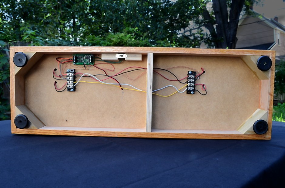 The underside, showing corner blocks, levelers, wiring, the NCE Switch-Kat decoder, and the programming switch.