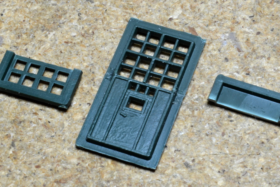With the roof finally under control, I also spent a little time on the front entrance. The cutout for the door had a blank piece of wall above it, which I removed. I chopped the top edge off the door insert, and added part of a window above it to fill the space. (My NWSL Chopper made this surprisingly easy to do.) I also used some strip styrene behind the wall to recess the door just a little. Study old industrial buildings, and you’ll notice that the front entrance—the one used by visitors—was the only one the architect put any effort into. Entrances used by workers received no embellishment.