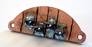 It so happens that I’ve got a sheet of printed circuit board material from Radio Shack. (Ahh, Radio Shack…remember them?) It’s clad with copper on both sides, made with a relatively strong fiberglass core, and the same thickness as both layers of the old panel. Why not give it a try? I taped pieces of the old panel in place, and used it as a guide to drill the holes. Twice, actually. The first time, I held the PCB down loosely on some scrap material, and the drill bit blew out the copper on the underside. The second time, I secured the PCB to a smooth scrap of MDF with double-stick tape, and the holes came out nice and crisp.