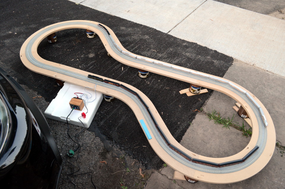 I placed the layout right at the head of the driveway, in front of the car. During assembly, I shimmed the cans on the low spots so that they’d properly support the roadbed, but made little attempt to level it. There might have been a 1-2% grade in spots, but nothing to be concerned about. Once everything was assembled, the track was laid out and snapped together, and a PowerCab attached to the feeders. (For simplicity’s sake, I suppressed my urge to rig multiple electrical feeders.) A folding chair, a small plastic table, and a citronella lantern completed the setup.