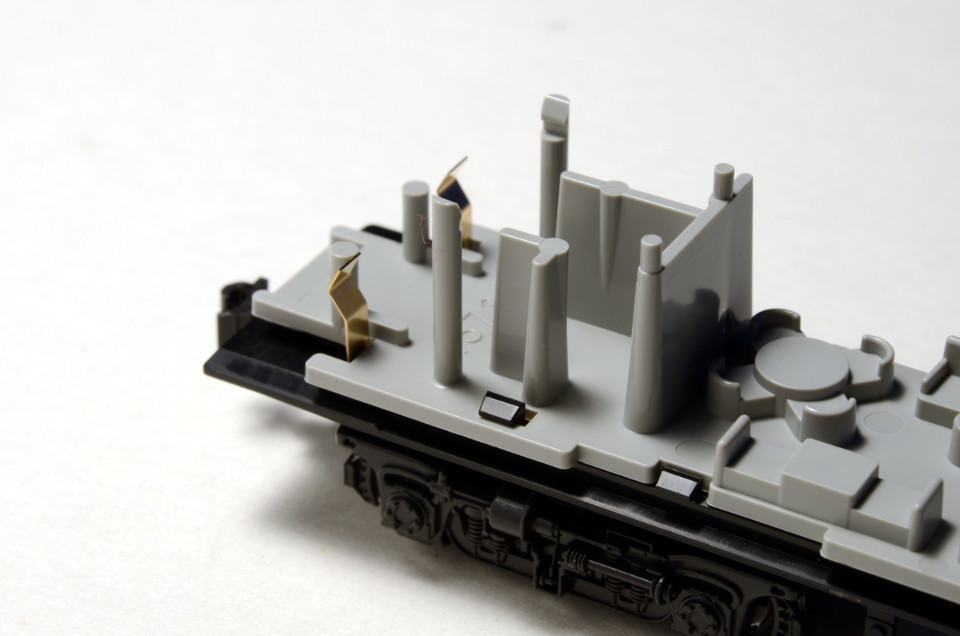 Before the car goes back together, the diffuser bar needs to be placed in the roof. Here’s another place where I discovered some changes Kato has made from past cars. The diffuser bar no longer needs to snap into the car’s window inserts, a task that I sometimes found tricky. It simply drops into position with the alignment tabs, and additional tall posts on the interior keep it in place after reassembly. Nice touch!