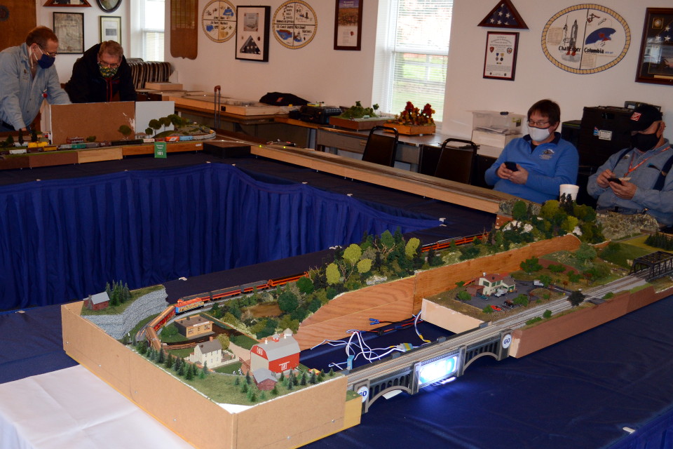 This year, of course, that didn’t happen. We did have one small exhibit earlier this month. One of our club members also belongs to an American Legion post in an outlying town, and arranged for us to exhibit there. We set up a modest T-Trak layout, the kind we’ve done for library shows. Setup took a little longer, as we’re out of practice. The ladies’ auxiliary made hot beverages and baked goods available. There were masks, hand sanitizer, a contact-tracing log, and other pandemic necessities on hand. So, yes, we did get to run trains once this season. It felt almost normal. Almost.