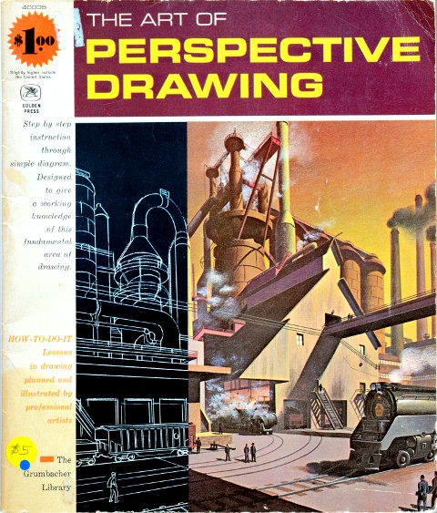 The book is “The Art of Perspective Drawing,” written and illustrated by Simon Greco, and published by Grumbacher in 1968. It’s one of those big how-to softcovers you’d find in any art-supply store (or used to, back in the days of physical art media. You kids have no idea!). It probably stayed in print for many years. Now that the search is over, let’s have a closer look, shall we?