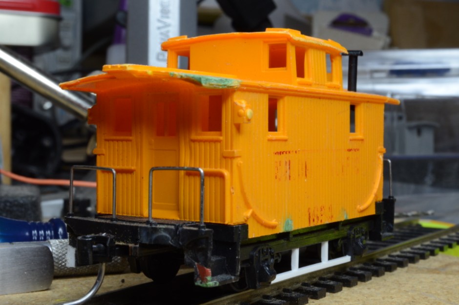 This bobber caboose—I think it’s Tyco, but I’m not sure—was in a train-show vendor’s dollar box, for good reason. It had apparently taken a hard drop to the floor, and suffered damage to the steps, undercarriage, and roof overhang. One chunk of step was completely broken off, and dangling by the end rail. A coupler was busted, too. For a few bucks more, I could’ve had a similar caboose in mint condition, but I went with this one.